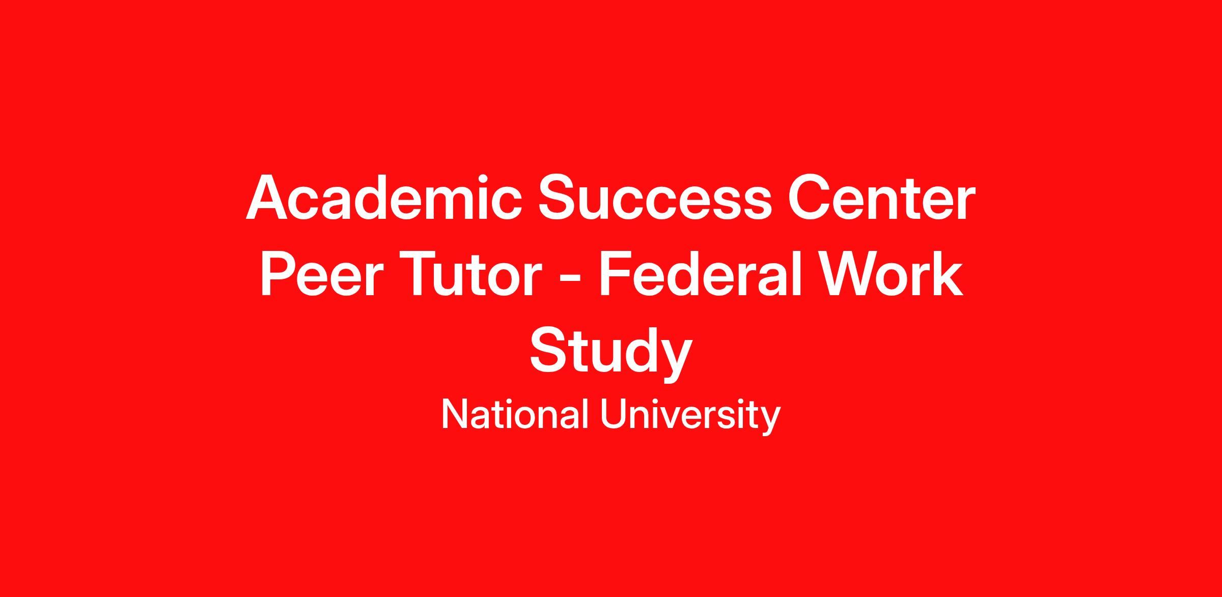 The Federal Work Study position is a part-time, student worker opportunity with National University. The students will provide general support and assistance to their selected department and will work on special projects as assigned and aligned with the student’s stated interests and career goals. Academic Success Center (ASC) peer tutors support students in comprehending academic concepts and developing study skills that will contribute to the student’s academic achievement. Tutors must possess a passion for helping and motivating students to learn new or complex concepts. Peer tutors assist fellow students individually, in small groups, or via ASC Chat to provide personalized support and encouragement.