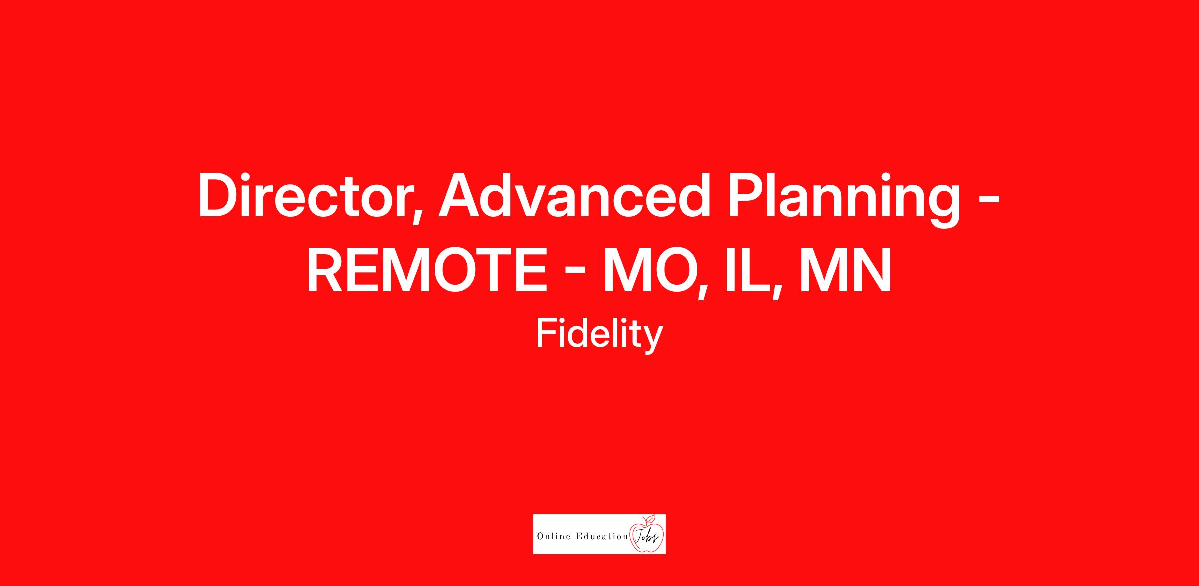 The Director, Advanced Planning is a client-facing role that serves primarily as an estate planning subject matter authority for Fidelity’s high net worth clients and their advisors as a member of a regionally-aligned Advanced Planning team providing comprehensive financial and estate planning support. Additionally, the Director, Advanced Planning will also be relied on to support the Vice President, Advanced Planning Market Lead to provide advisor training, regional business development and thought leadership. We primarily use video technology to function remotely and meet virtually with clients and advisors across the region. We also collaborate within the Advanced Planning team both virtually and in-person to maintain and increase our collective impact on the clients we serve. Travel is typically expected between 5% and 20% of time, depending on physical proximity to regional sites and investor centers. This role is remote but does require residing within commuting distance to an Investor Center in the Chicago, IL or St. Louis, MO locations.
