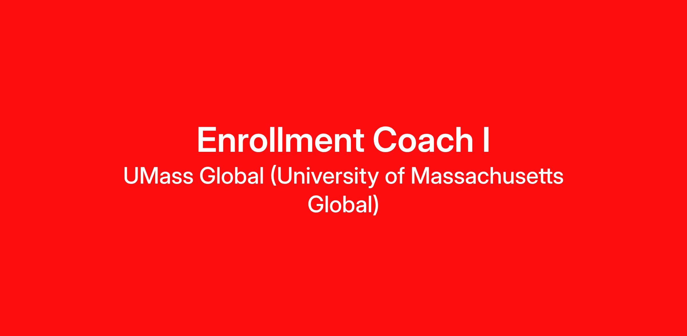 Responsible for supporting prospective students through their initial inquiry, application, and admission phase. This position utilizes a consultative sales approach to understand the prospective student’s needs, determine whether UMass Global will meet their educational goals, and if appropriate, make a compelling recommendation for them to attend UMass Global. This individual helps to facilitate the enrollment process by making frequent phone contacts with the prospective student, by connecting the prospective student with relevant campus personnel (e.g. Academic Advisors and One-Stop Specialists), and by overcoming prospective student objections when appropriate.