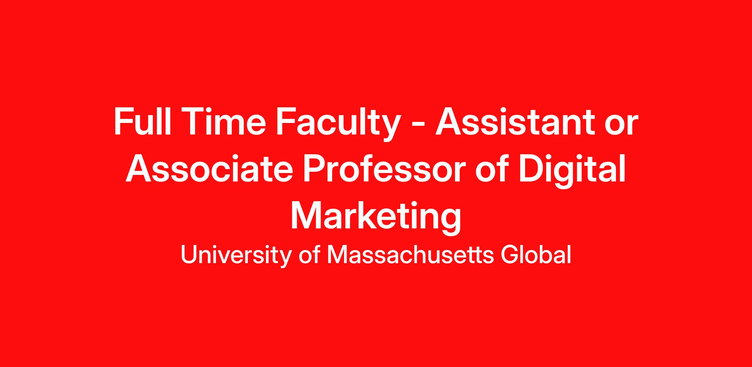 Are you passionate about expanding access to education and shaping the future of Digital Marketing? The School of Business & Professional Studies at the University of Massachusetts Global is seeking a dynamic, mission-driven faculty member to join our fully remote academic community starting August 2026 This full-time appointment is anticipated at the Assistant Professor level, with consideration for Associate Professor based on experience.