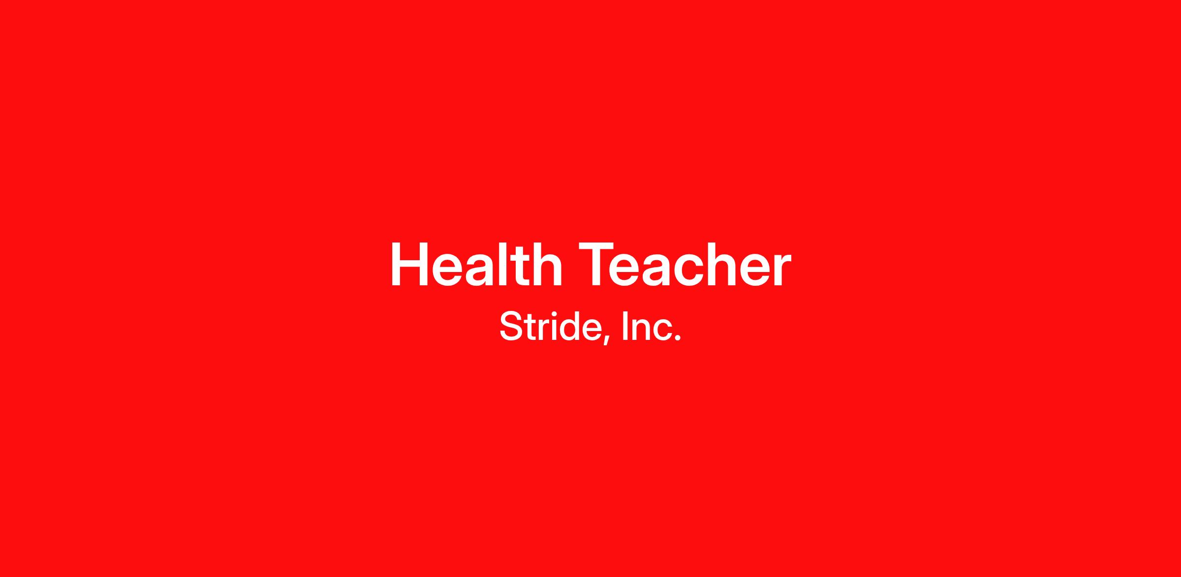 The Health Teacher is a highly qualified, state certified educator responsible for delivering specific course content in an online environment. Health Teachers provide instruction, support, and guidance, manage the learning process, and focus on students’ individual needs. Health Teachers monitor student progress through Stride K12’s learning management system. They actively work closely with students and parents/learning coaches to advance each student’s learning toward established goals. Health Teachers typically work from home but must travel occasionally throughout the year to various school functions, such as state testing or as otherwise required by the school.