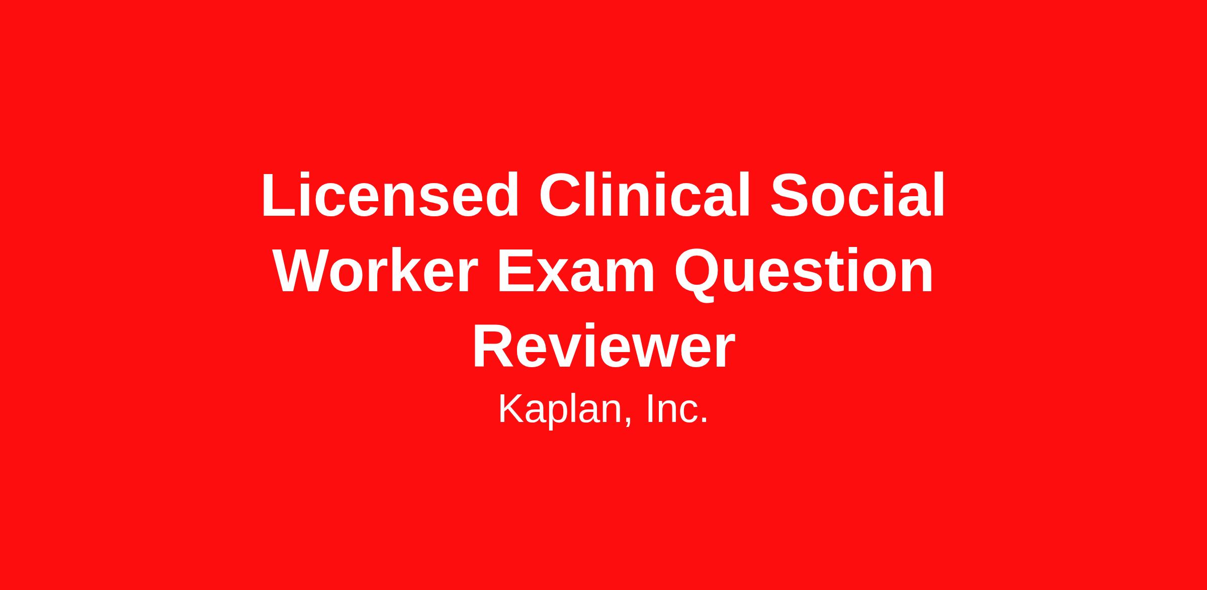 Project Description Kaplan is seeking a Licensed Clinical Social Worker Exam Subject Matter Expert to join us as a Contractor to contribute to the development of test-like exam questions. This is a remote and asynchronous opportunity, allowing you the flexibility to complete the work outside of standard business hours.