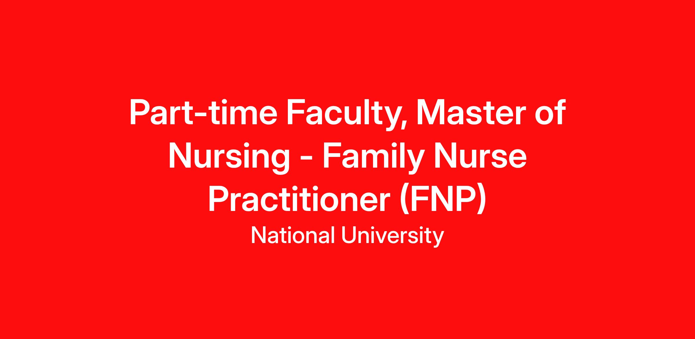 The Department of Nursing, in the School of Health Professions at the National University invites applications for part-time faculty in Nursing with a specialization in Family Nurse Practitioner (FNP). The successful candidate will have a demonstrated record of or potential for excellence in teaching in their field and a commitment to serving the university’s diverse adult student body. The successful candidate will have the potential for a commitment to serving the university’s diverse adult student body. This position primarily works closely with the Academic Program Director and other faculty within the program and contributes to ensuring program quality, student engagement, and success.