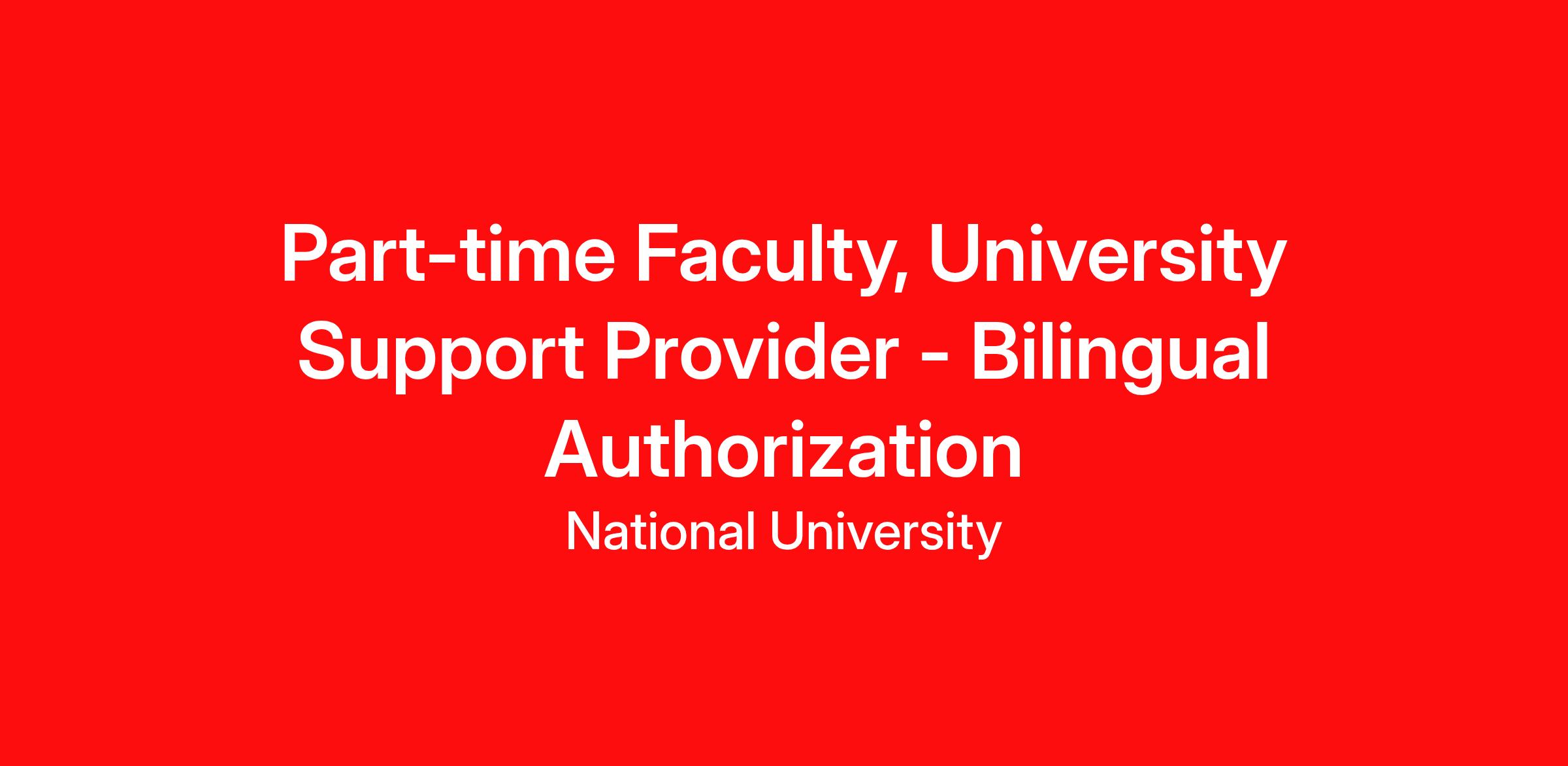 The Department of Teacher Education in the Sanford College of Education at the National University invites applications for part-time faculty in University Support Provider - Bilingual Authorization. The successful candidate will have a demonstrated record of or potential for excellence in teaching in their field and a commitment to serving the university’s diverse adult student body. The successful candidate will have the potential for a commitment to serving the university’s diverse adult student body. This position primarily works closely with the Academic Program Director and other faculty within the program and contributes to ensuring program quality, student engagement, and success.