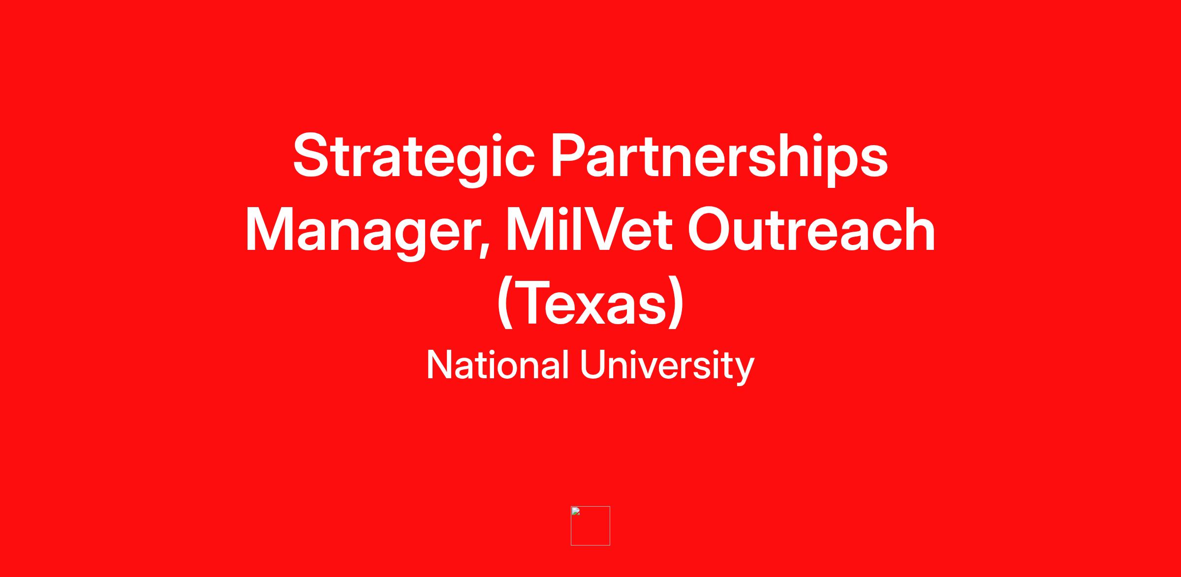 The Strategic Partnerships Manager, MilVet Outreach provides vision, intellectual leadership, coordination, strategic planning and implementation of a system-wide framework and efforts to promote and grow Military and Veteran Affiliated Strategic Partnerships for National University. The Strategic Partnerships Manager develops and executes national initiatives (Army, Air Force, Navy, Marine Corps, Coast Guard, Space Force, National Guard, Reserve, Military Spouses and Dependents, Veterans, and Veteran Spouses and Dependents) and oversees third-party partner strategic relationships within their assigned geographic area of responsibility (including but not limited to Military Installations, Education Services Officers, Veteran Service Organizations, Chambers of Commerce, State and Regional Advisory Councils on Military Education).