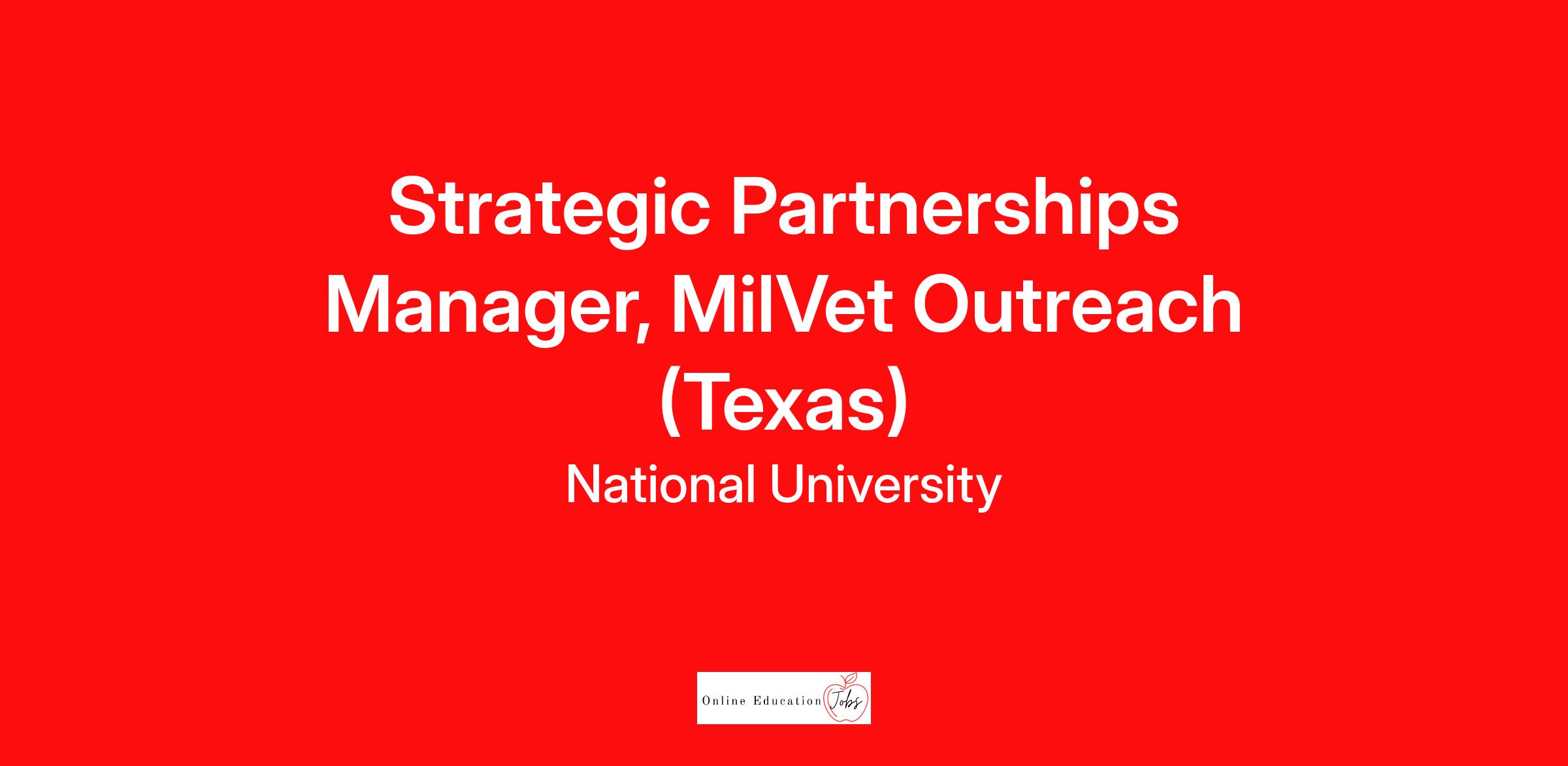The Strategic Partnerships Manager, MilVet Outreach provides vision, intellectual leadership, coordination, strategic planning and implementation of a system-wide framework and efforts to promote and grow Military and Veteran Affiliated Strategic Partnerships for National University. The Strategic Partnerships Manager develops and executes national initiatives (Army, Air Force, Navy, Marine Corps, Coast Guard, Space Force, National Guard, Reserve, Military Spouses and Dependents, Veterans, and Veteran Spouses and Dependents) and oversees third-party partner strategic relationships within their assigned geographic area of responsibility (including but not limited to Military Installations, Education Services Officers, Veteran Service Organizations, Chambers of Commerce, State and Regional Advisory Councils on Military Education).